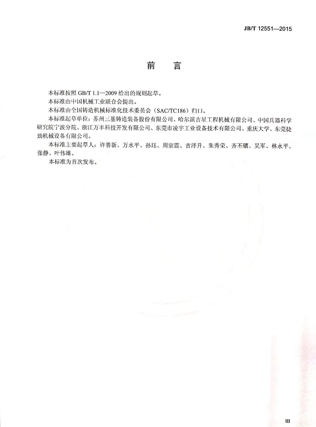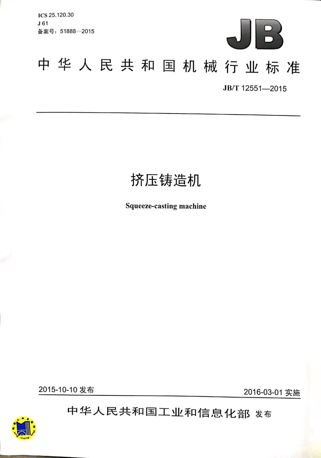 由蘇州三基鑄造裝備股份有限公司主持,哈爾濱吉星工程機(jī)械有限公司、中國兵器科學(xué)研究院寧波分院等單位參與制定的《擠壓鑄造機(jī)》行業(yè)標(biāo)準(zhǔn)于2015年10月10日發(fā)布,并于2016年3月1日起正式實(shí)施。該標(biāo)準(zhǔn)為國內(nèi)在擠壓鑄造領(lǐng)域制定的首個(gè)標(biāo)準(zhǔn)。