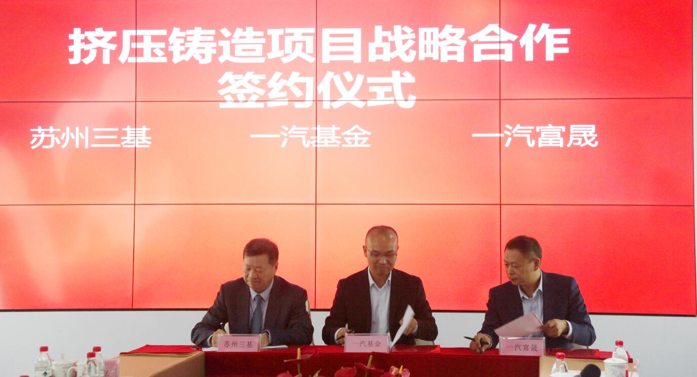 會(huì)議第三個(gè)議程,一汽基金、蘇州三基、一汽富晟等三家單位針對(duì)擠壓鑄造業(yè)務(wù)簽訂了擠壓鑄造項(xiàng)目戰(zhàn)略合作協(xié)議,未來將圍繞擠壓鑄造業(yè)務(wù)合作設(shè)立新公司,共同開拓?cái)D壓鑄造汽車零部件業(yè)務(wù),目標(biāo)重點(diǎn)針對(duì)紅旗品牌汽車零部件業(yè)務(wù)。