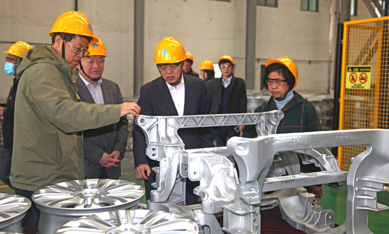 專家組察看示范線生產(chǎn)的整體式副車架、汽車輪轂等典型零件