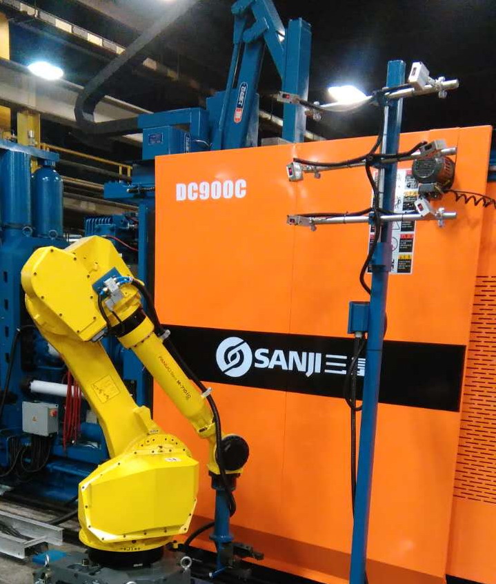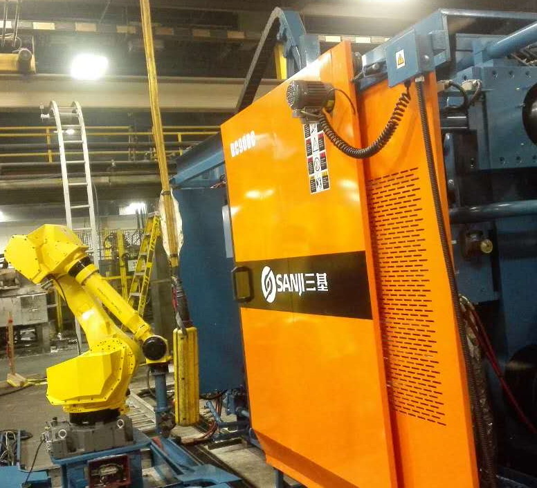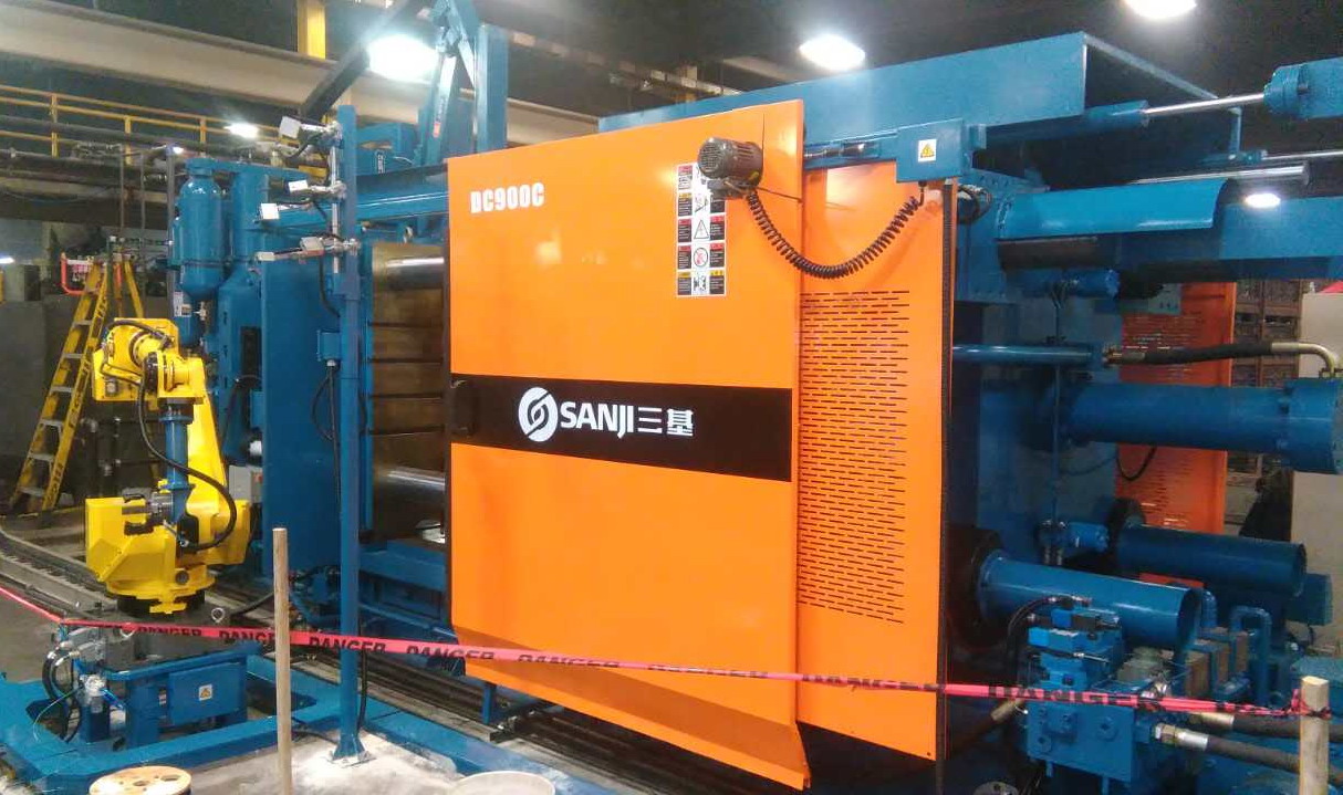 蘇州三基依照美國的UL認(rèn)證安全要求設(shè)計(jì)了歐美版臥式冷室壓鑄機(jī)系列產(chǎn)品,該產(chǎn)品在電氣控制系統(tǒng)、液壓油路、合模系統(tǒng)、機(jī)座系統(tǒng)等方面進(jìn)行了全新設(shè)計(jì),合模機(jī)構(gòu)的模板、曲肘系統(tǒng)全部采用鑄鋼件,大大提高了壓鑄機(jī)的整體剛性。其中900噸臥式冷室壓鑄機(jī)已于2016年10月份成功銷往美國市場,該設(shè)備采用AB控制系統(tǒng)和美國VTW實(shí)時控制系統(tǒng),集成了給湯機(jī)、噴霧機(jī)、取件機(jī)器人、切邊機(jī)等自動化設(shè)備,組建了一個自動化壓鑄島,用于汽車零部件的自動化生產(chǎn)。設(shè)備目前正處于安裝調(diào)試階段,將在2017年2月份正是達(dá)產(chǎn)。